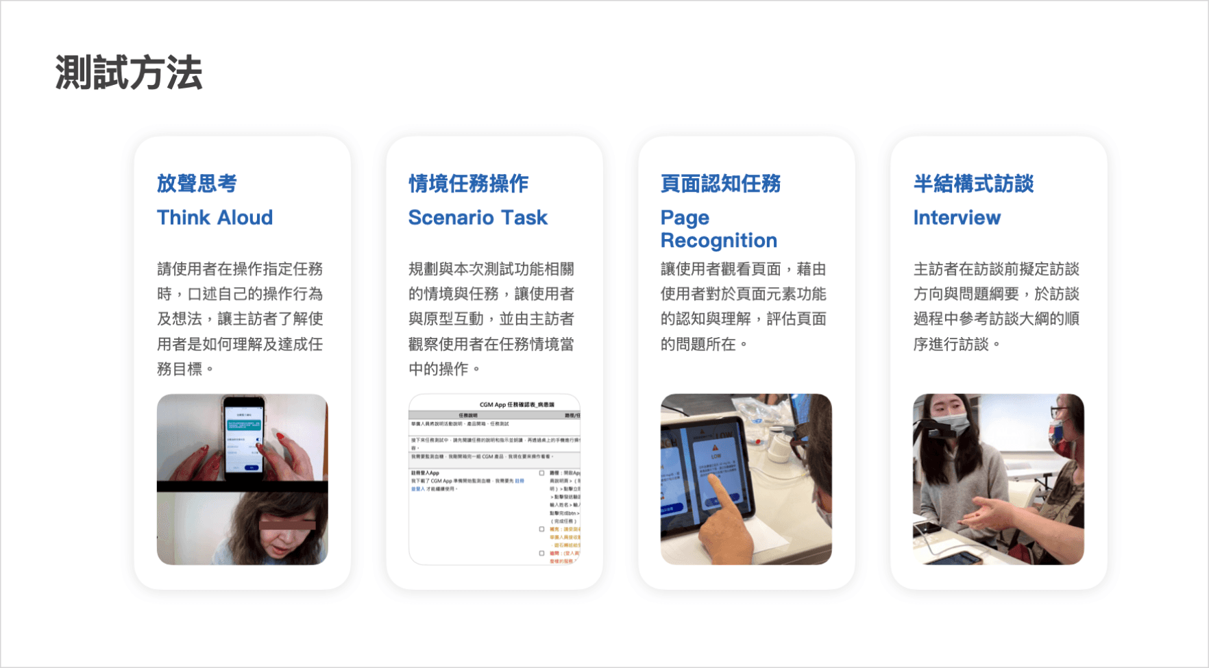 採用放聲思考、情境任務操作、頁面認知任務、半結構式訪談等測試方法,以盡可能獲得最完整、最直接的使用者回饋。