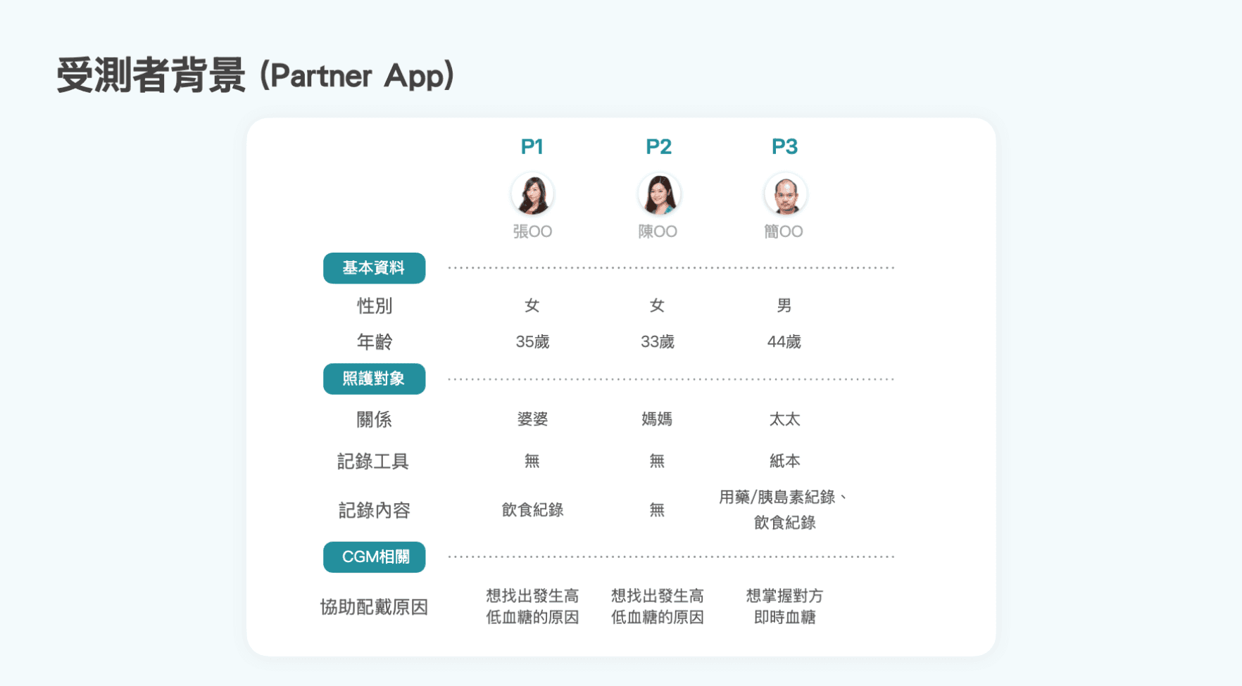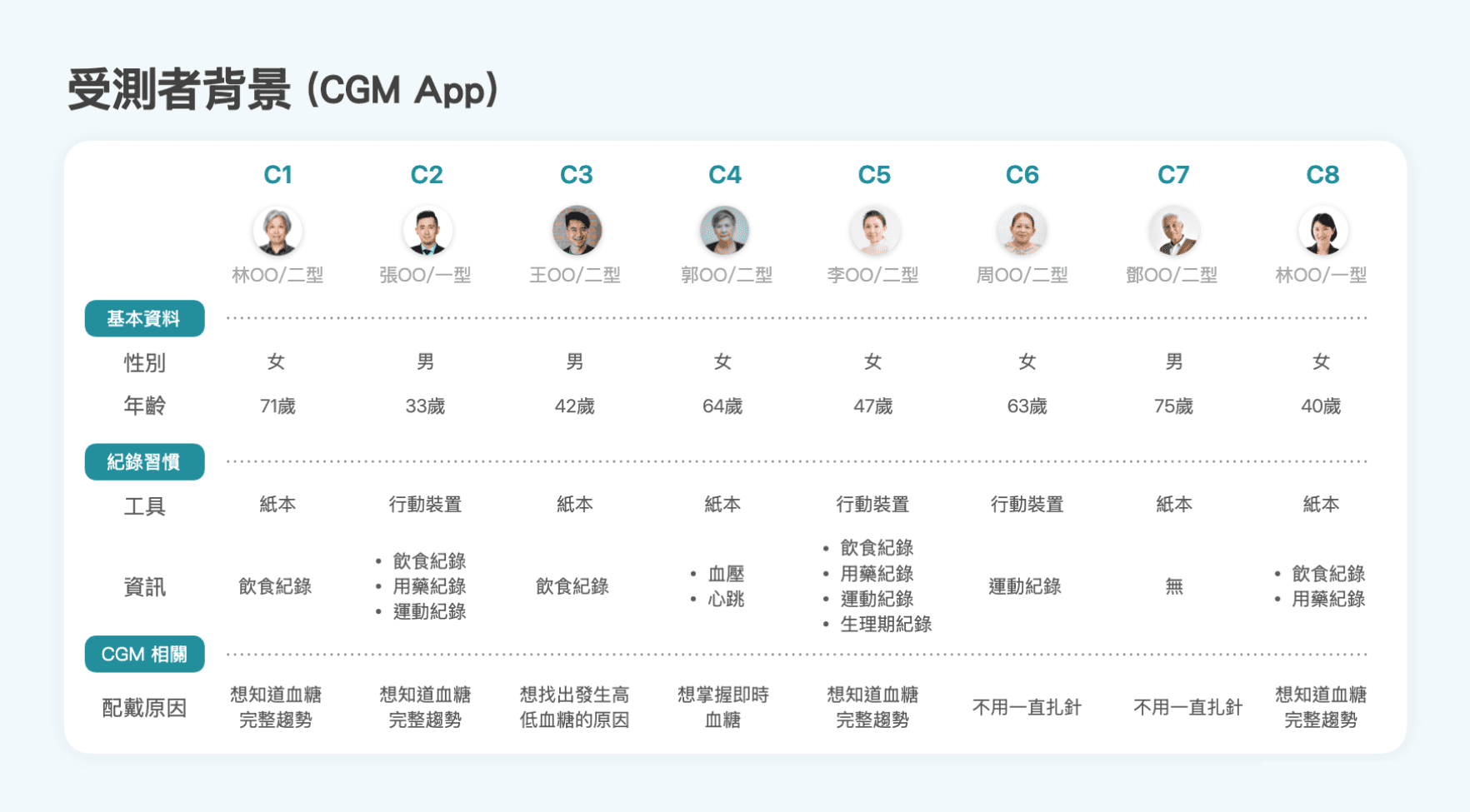 與華廣進行多次討論後,最終決定易用性測試的對象為「8 名不同年齡、性別及嚴重程度的糖尿病患者」,以及「其中 3 名患者的居家照護者」,以涵蓋主要的使用者族群。