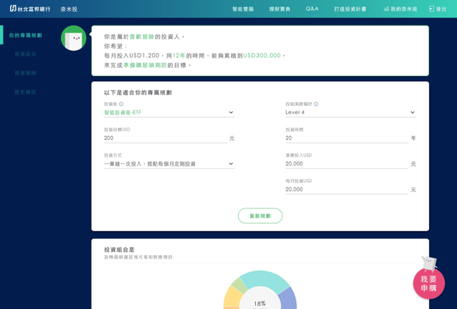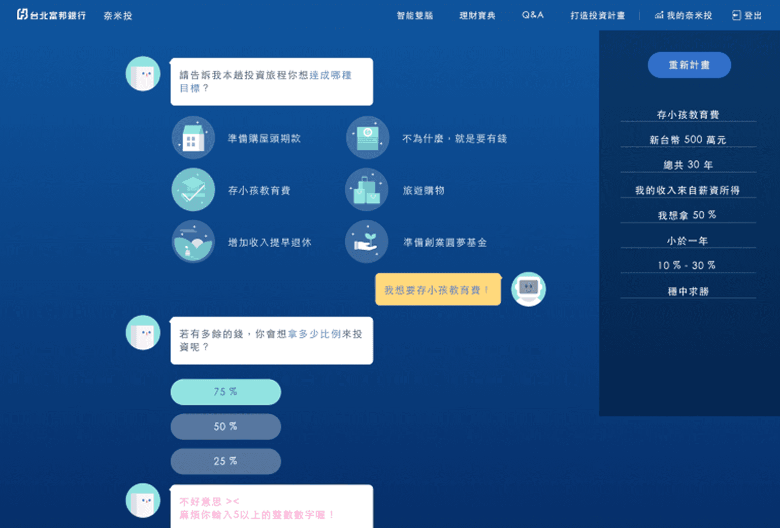 不同於一般競品情境式的寫實風格,奈米投採用圖像智能機器人角色引領投資人進入智能理財情境。過程中機器人與投資人進行問答互動,了解確切的投資需求,迅速產出個人化的投資試算,讓投資人實際體驗智能理財的核心價值。