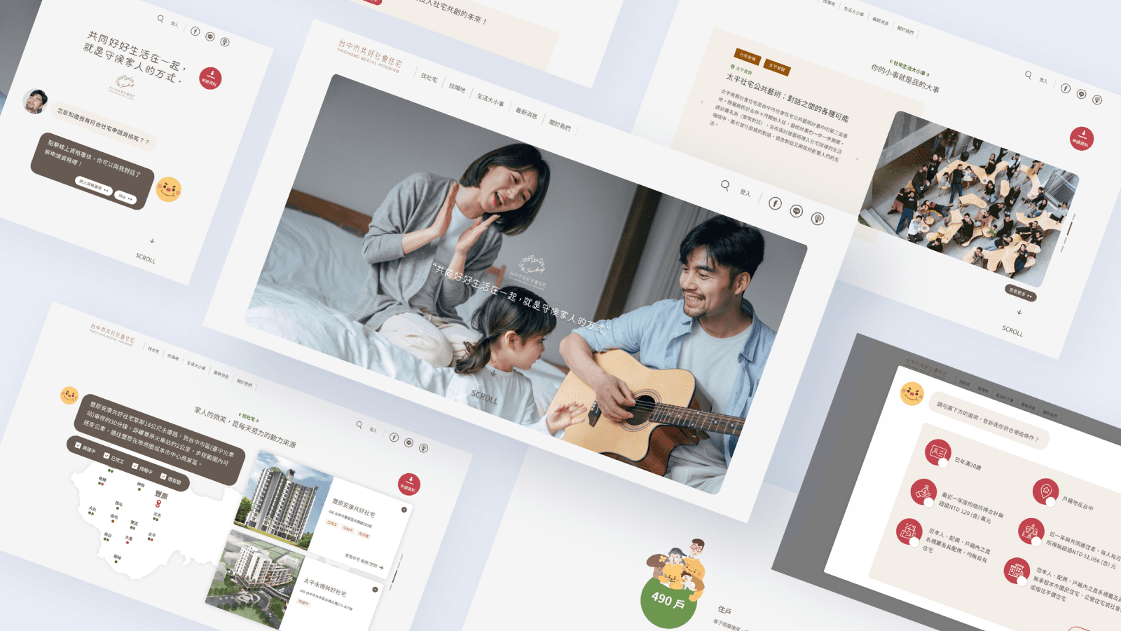 政府各機關單位在數位平台上因政策繁多,資訊整合呈現往往不易,民眾在市府網站的市政公告中透過關鍵字搜尋社宅相關資訊也不方便。「臺中社宅一站式入口網」首頁以「三明治世代」小家庭形象照片和「共同好好生活在一起,就是守候家人的方式」標語,突顯首要使用族群和社宅品牌價值。