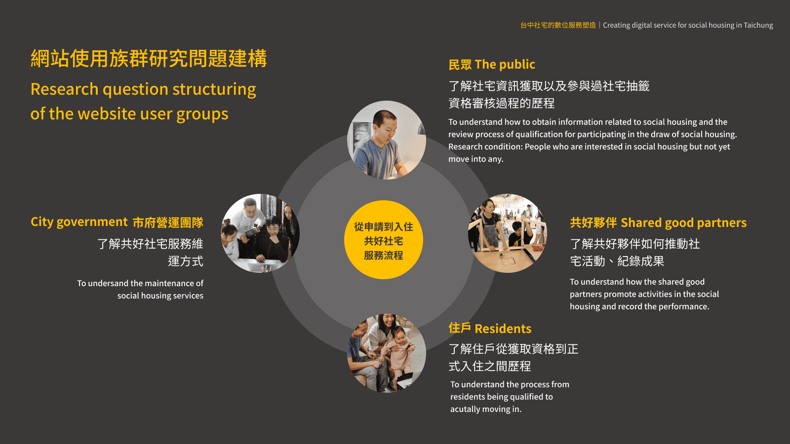 遊石在建立「臺中社會住宅一站式入口網」的數位服務目標後,需進一步釐清置放於數位服務之中的功能需求,建立研究問題以脈絡訪查、問卷、焦點團體、數據判斷,四種不同的研究方法交叉使用釐清住戶/共好夥伴/民眾/市府團隊,不同的使用者族群。