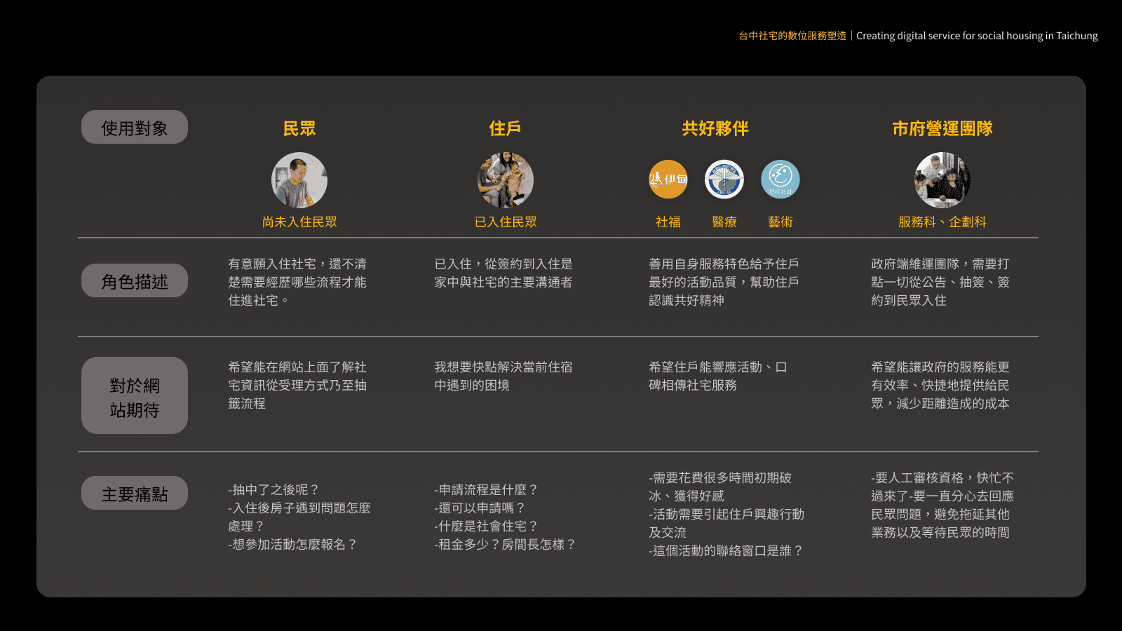透過研究洞察不同使用對象的需求後,遊石在數位上展現社宅生活現況、考量民眾需求,提出合適的社宅政策在數位上的服務,承接「關心、重視、信賴」的共好文化,強調「即時、完整、便利」的數位特性,在「臺中社會住宅一站式入口網」透過提供民眾服務入口、整合社宅服務與活動等,塑造公部門數位服務,以不同面向之四種使用者建構核心問題如何解決之策略——