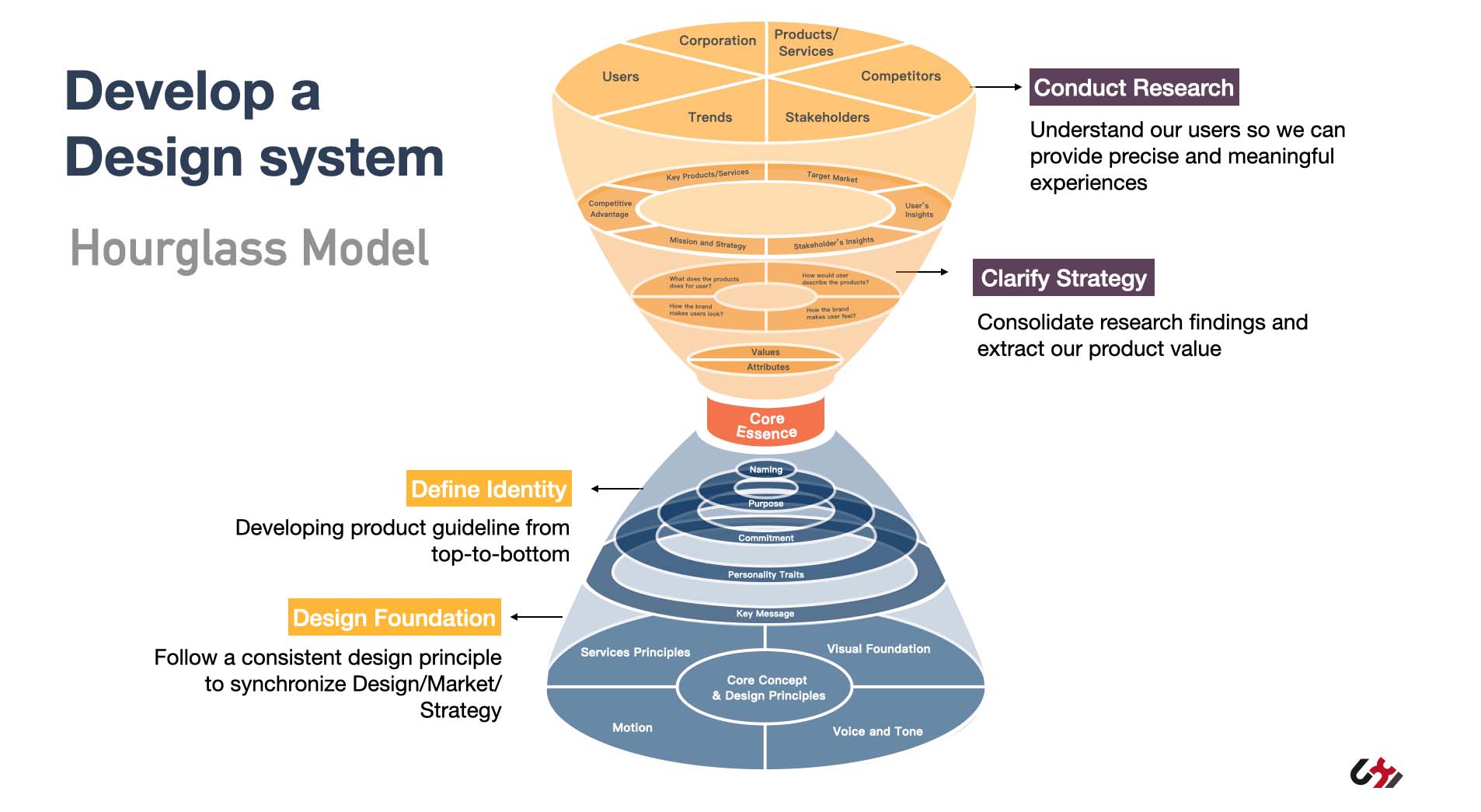 品牌延伸至數位需要從設計研究開始。從研究階段直到萃取出自行車品牌下的品牌精神,我們使用了漏斗模型來逐步盤點,巨大集團內部對於數位品牌的詮釋與認知。以關係人的研究探討作為起始點,經由集團內部的專家訪談、實體產品與系統協作方的專家訪談、巨大集團數位產品服務的現況探討,然後提出數位體驗策略及規範架構,最後發展整理成為數位體驗上的設計規範,並透過現有產品的改版模擬來進行規範可行性與適用性的驗證。