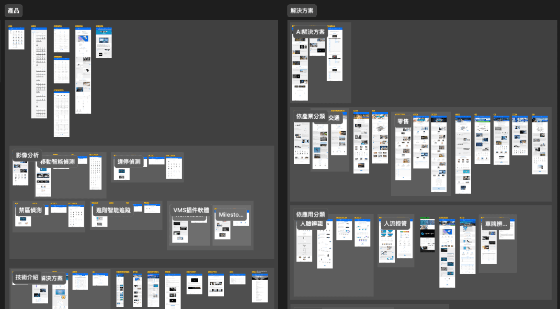 遊石在接獲委託之後,先花費大約 2~3 週的時間,將現行官網所有頁面截圖,以親和圖法進行分類整併。而過程當中,也參考了主要競品網站的版型設計與分類方式,並與 Vivotek 不斷討論確認,最終成功把 1,400 個以上的頁面、近 200 種的頁面類型,合併為大約 30 個版型以及若干變化型。